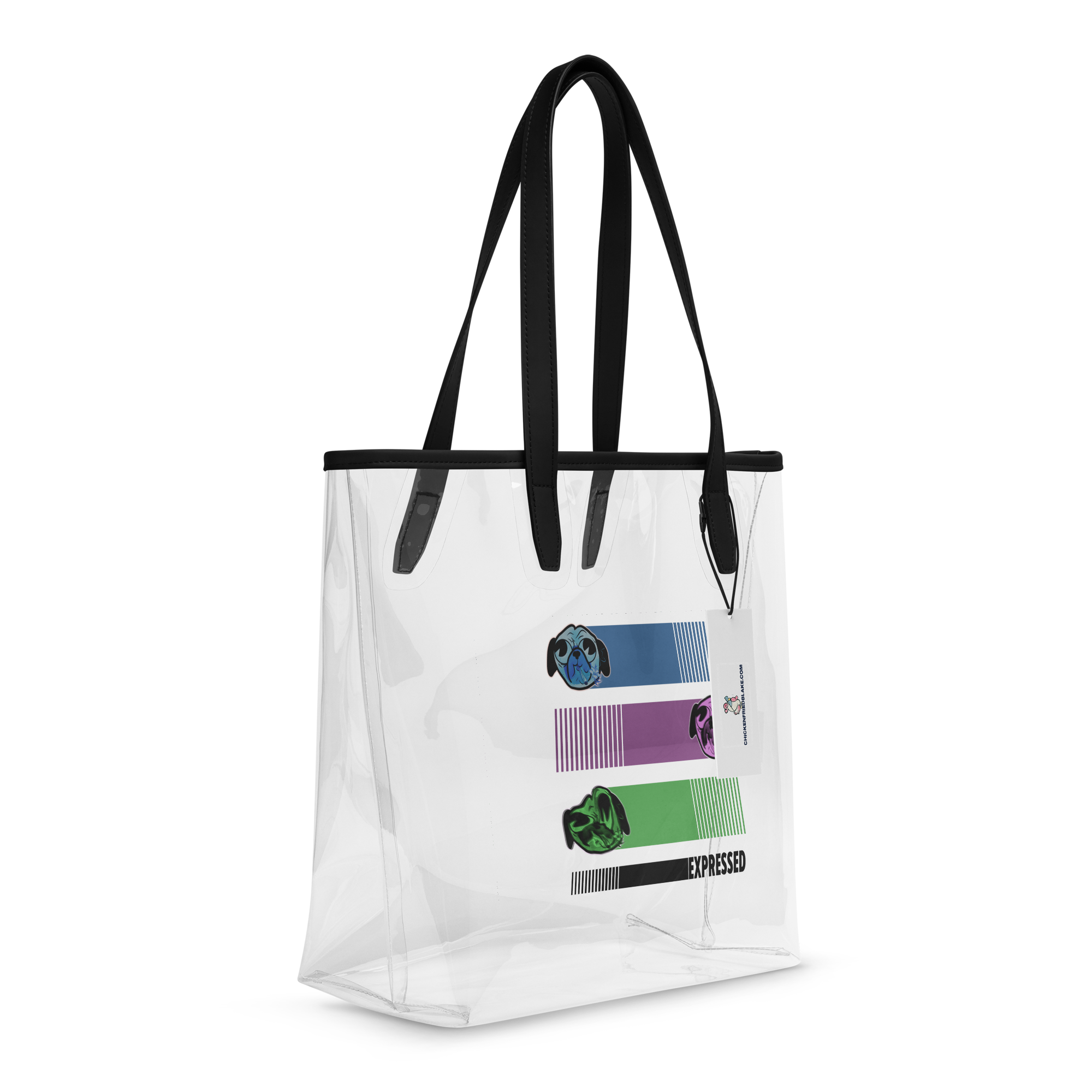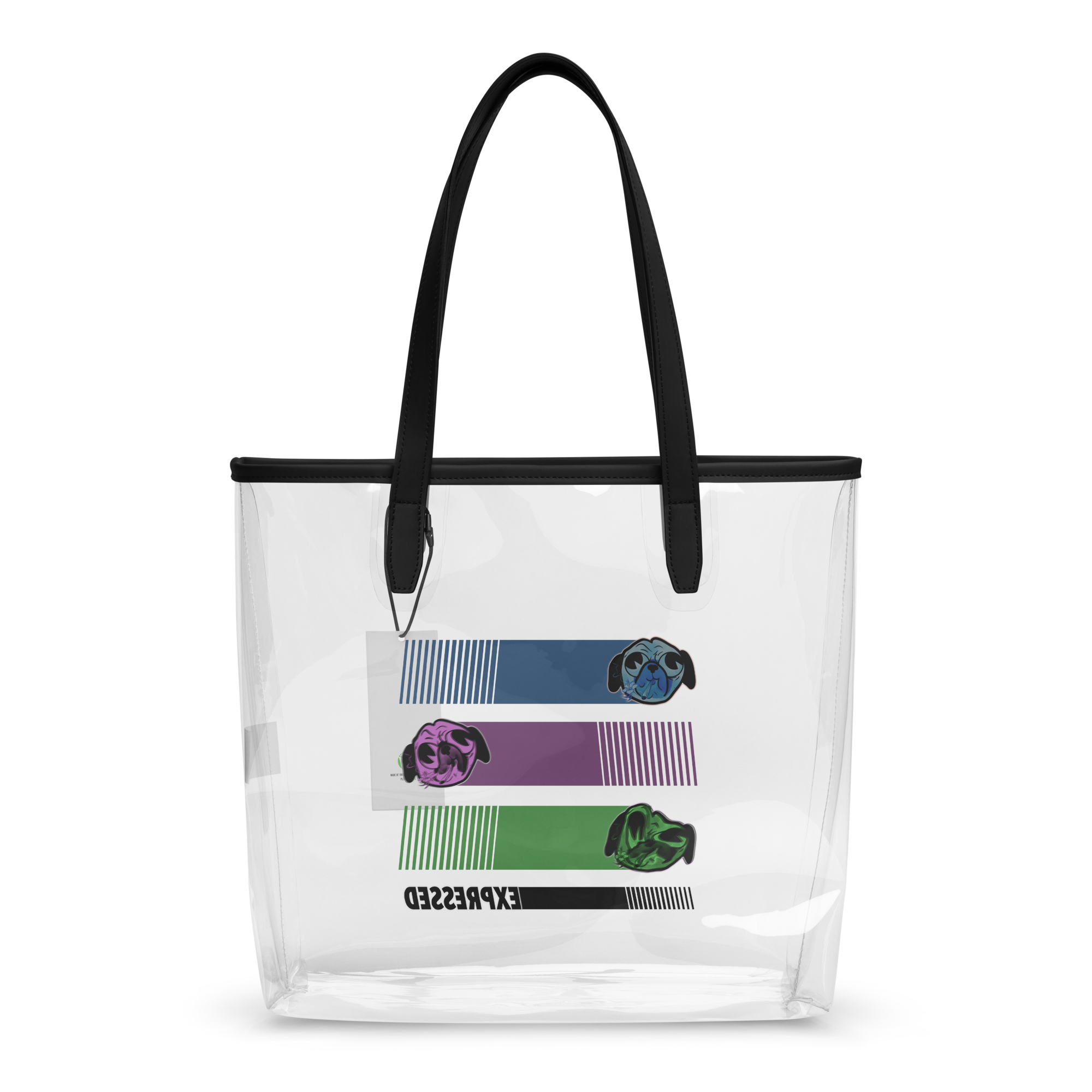 Art Meets Transparency. Upgrade your street style while keeping your essentials visible and secure. We’ve moved our highly unique "Expressed" pug series—featuring the stylized blue, green, and violet pugs and the iconic hibiscus-smoke pug—onto a sleek, transparent canvas. This isn't just a security bag; it’s a piece of mobile art from a local OKC artist, redesigned for the modern city-dweller.